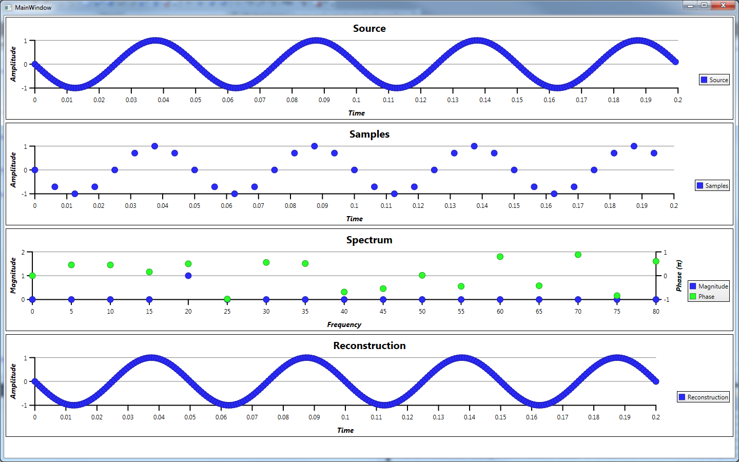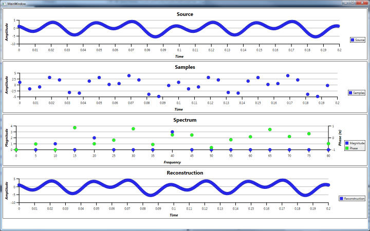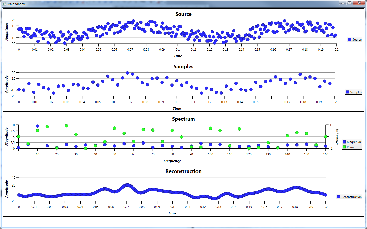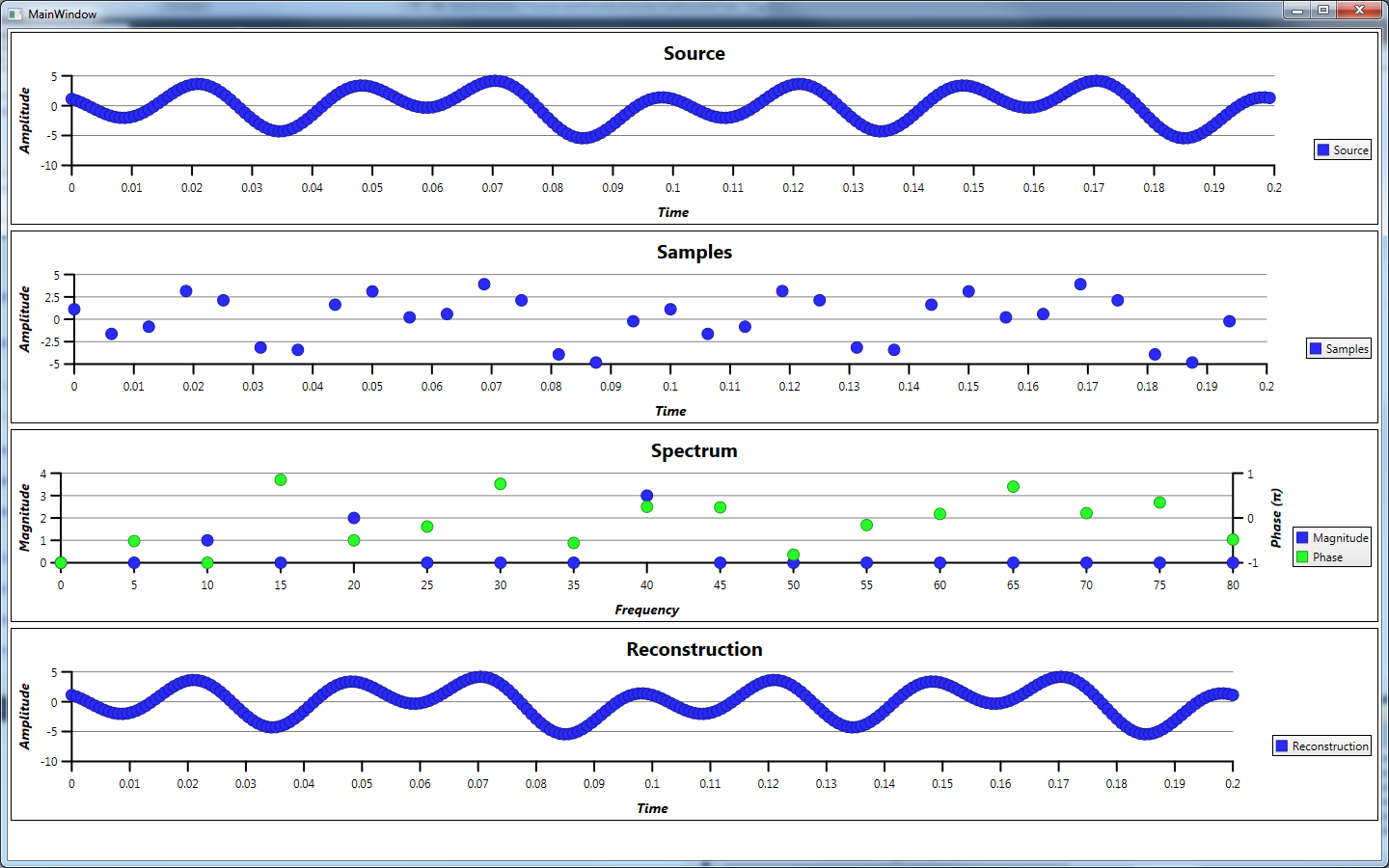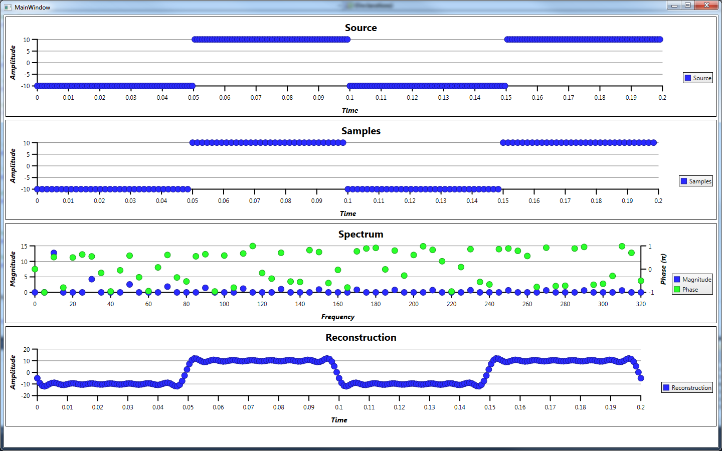 This project was to perform a Discrete Fourier Transform (DFT) on a sampled signal and determine its power spectrum. Each example produces a signal determined by an equation f(t). The first graph displays the original source signal. The second graph shows the discrete data points used in the DFT. The third graph charts the magnitude of each frequency and its phase angle in pi radians. The final graph plots the reconstructed signal using its power spectrum. The charting control is an example of one of the controls developed for Mapromar.